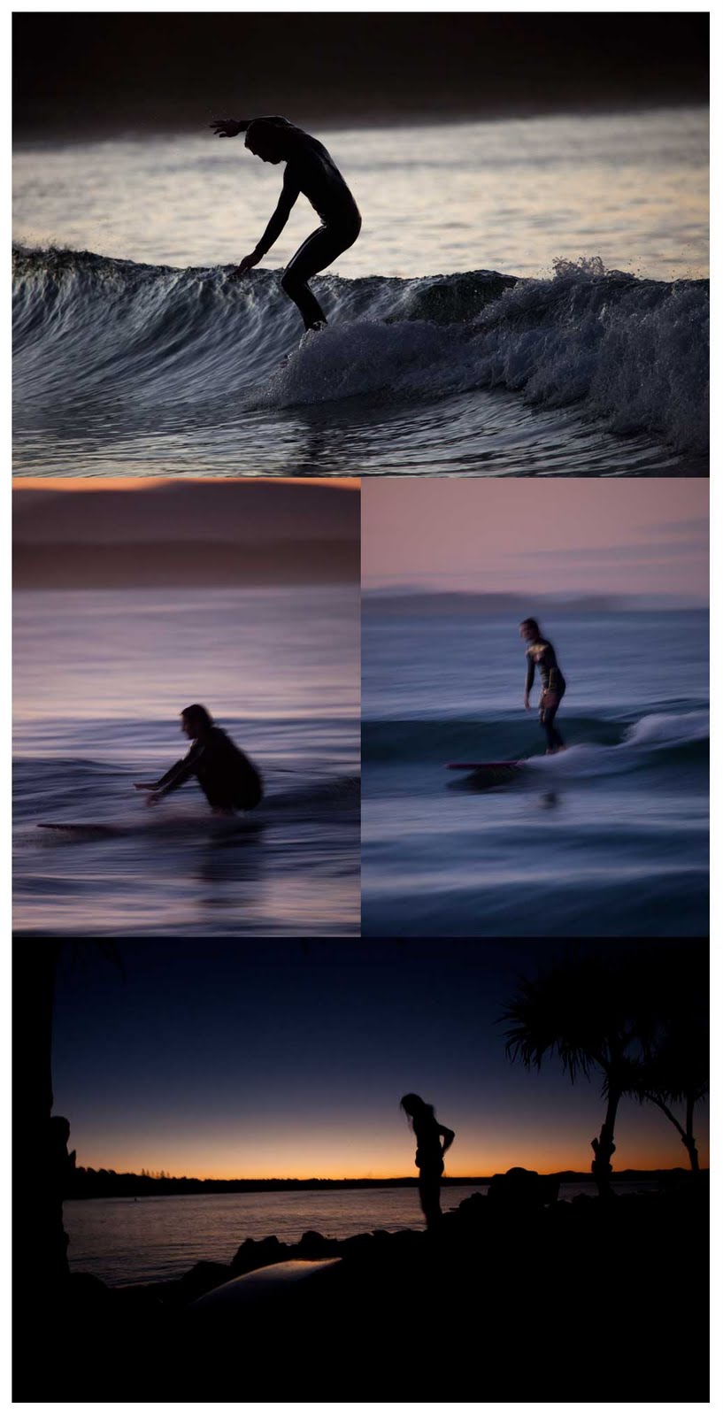 I love heavier, single fin, traditional style Logs and I love surfing from afternoon to night, watching the colours float across the sky between waves.